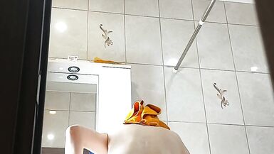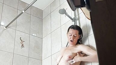 . Forgot to close the shower door. Hairy pussy,hairy armpits, milf wet, peeing , masturbation in the shower. smeared with cream. a very fluffy bush.