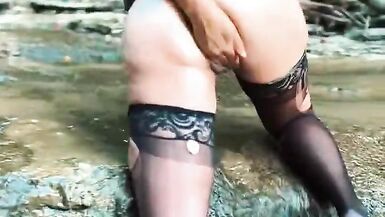 MILF FISTS HERSELF ON A WATERFALL IN TORN STOCKINGS