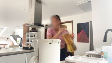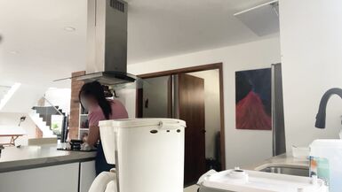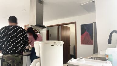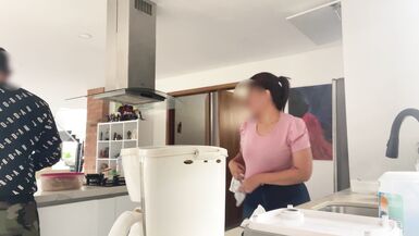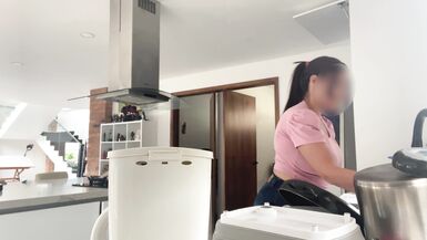 . while his delicious maid is making her boss something to eat he is helping himself to all the goodies that she has to offer not just her cooking skills pulling out those huge natural saggy tits and a nice firm ass giving her some great spanks