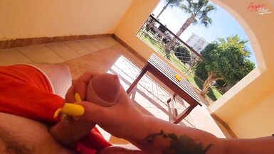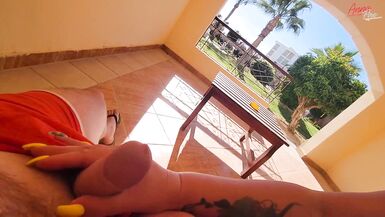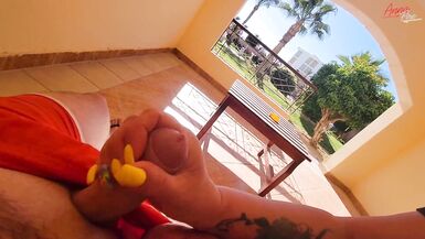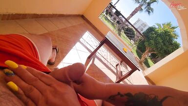 STEPMOM JERKED OFF RIGHT ON THE TERRACE