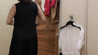 . 53 YO petite MILF with blonde hair and blue eyes tries on a few things in the dressing room. Then, she takes out a dildo and fucks herself in an outfit. She takes the outfit off and fucks again. Then, puts on the black dress for a final squirting orgasm.