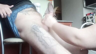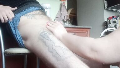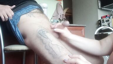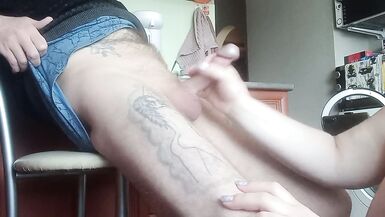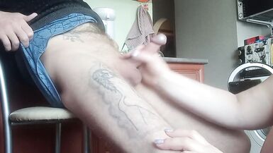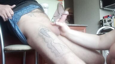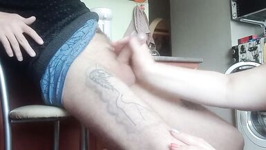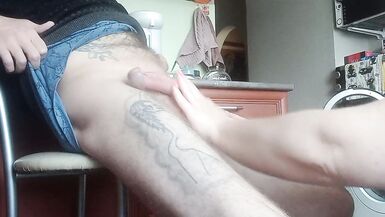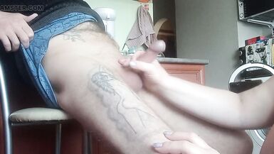 . a fat woman naked jerks off my cock to a cumshot in the kitchen