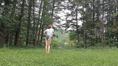 . This video was shot in Hokkaido, Japan. I wear sexy denim shorts and have the cameraman film me in them. Please take a look at the scene. These shorts have zippers to open up the buttocks and crotch. They are nice shorts and I would use them again for the shoot. It felt great to shoot in the beautiful green nature at the end of summer.