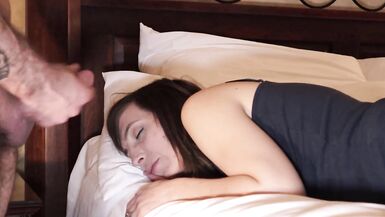 . Stepson has no idea his stepmom is still awake and enjoying it. As that babe rolls over and that guy makes a run for it, that guy comes back to finish her with a facial, as this chab goes to clean the cum up...it's gone..