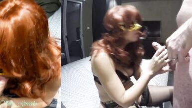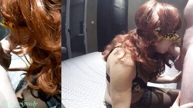 REDHEAD MILF IN SEXY LINGERIE AND STOCKINGS GIVES A BLOWJOB AND TAKES A BIG CUMSHOT ON HER BIG TITS