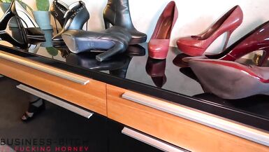 . business bitch shows her high heels collection - gives a nice shoe job wearing her sexy wedges